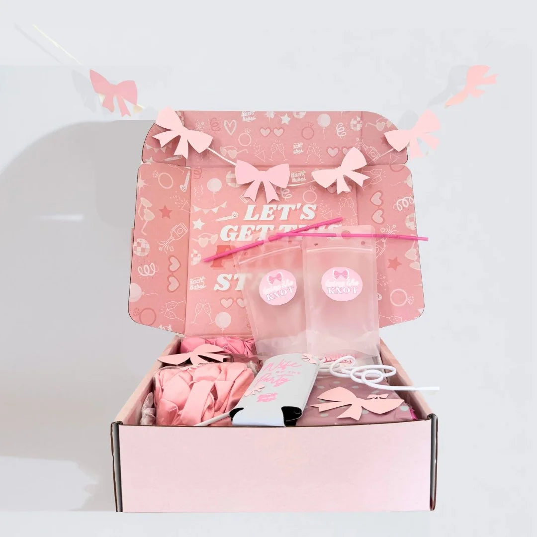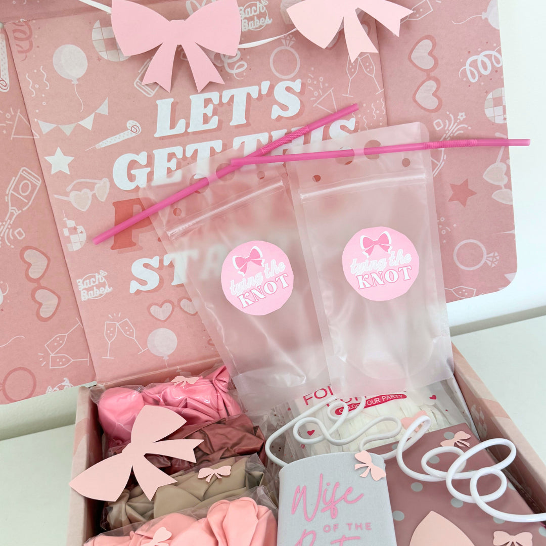 The “She's Tying The Knot" bach box is all about bows, pinks, and celebrating everything girly glam! Inside this box, you'll find everything you need to throw an over the top bachelorette party, from bow balloon decor to to coquette vibe table settings. With easy setup instructions, you'll be toasting to the bride-to-be in no time!