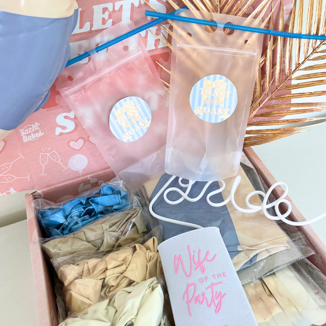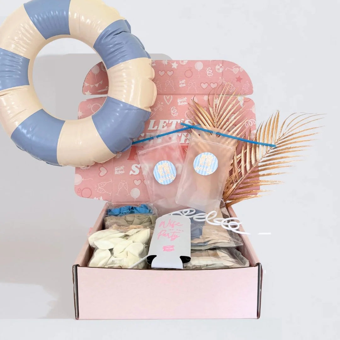Theres nothing worse than trying to get all the decor supplies ready on top of planning the perfect weekend so it’s time to Toast On The Coast with this coastal bach box! It's all about coastal vibes, toasting to the coast, and celebrating by the shore! Inside this beachy box, you'll find everything you need to throw a coastal-grandma themed party, from cute floats to beachy decorations. With simple setup instructions, you'll be toasting to the bride in no time.